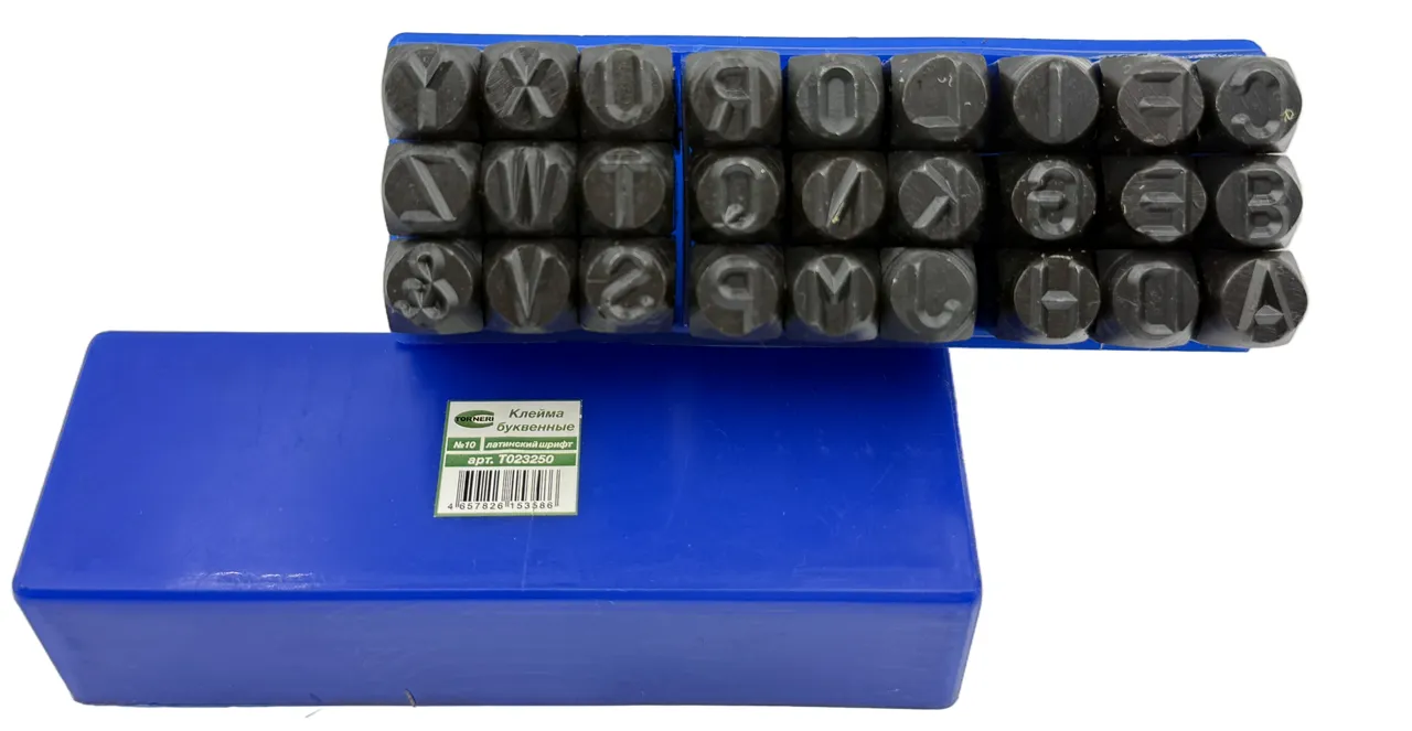 Клейма буквенные № 10 латинский шрифт TORNERI Т023250 представляют собой отдельные металлические стержни с зеркальным изображением букв, которые можно комбинировать в необходимом порядке для набивания слов или фраз. Они предоставляют возможность создавать уникальные маркировки или надписи на различных материалах, таких как дерево, металл, пластик, кожа и текстиль.
