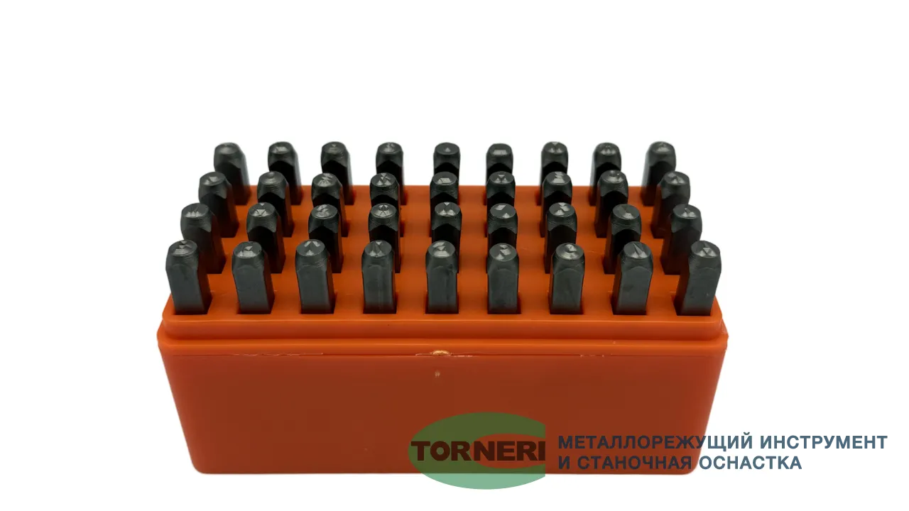 Комплект состоит из 36 клейм с прописными буквами алфавита от А до Я, доп.знаки: @, &, - .