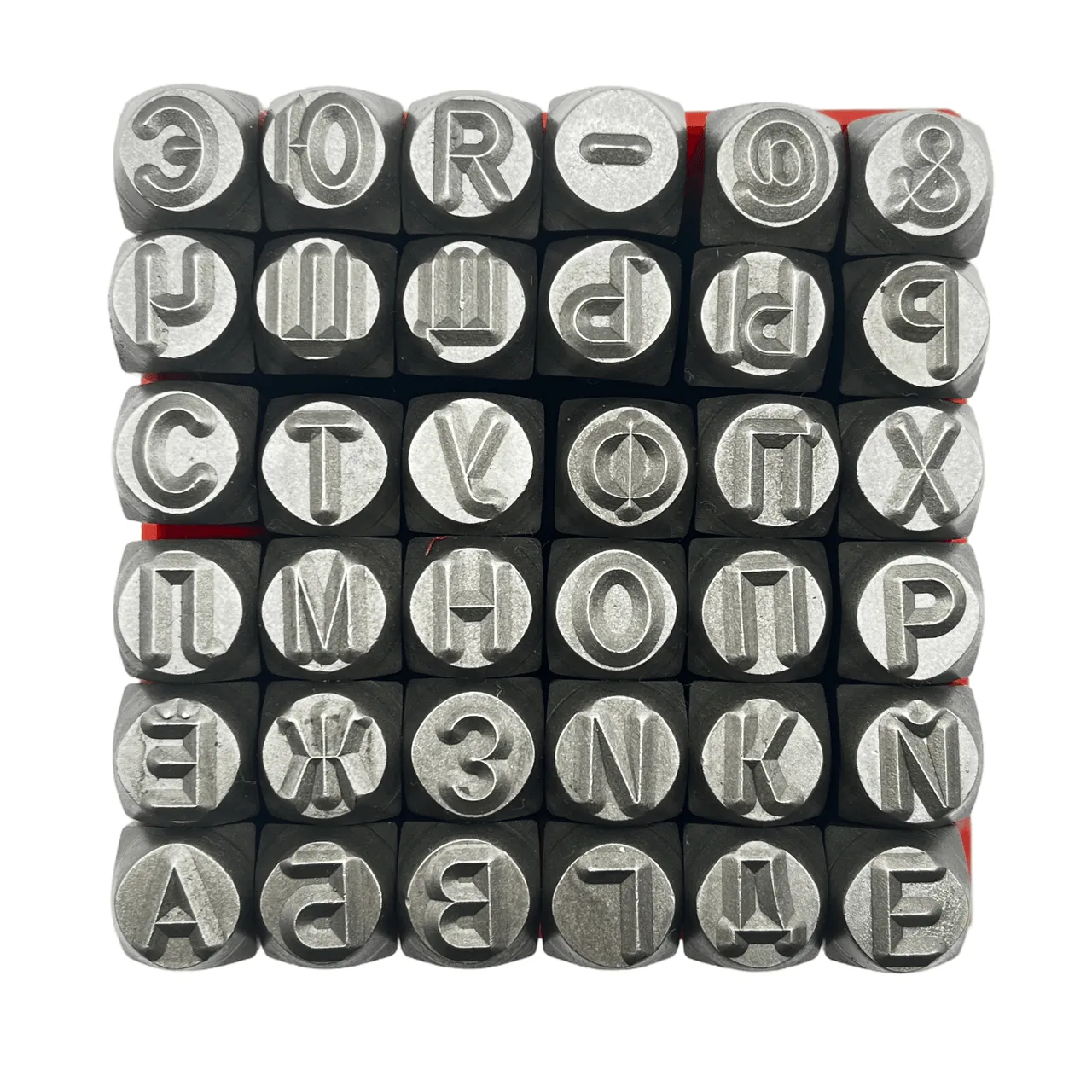 1) Полный алфавит – 36 клейм с прописными буквами от А до Я, а также дополнительные символы (@, &, -)