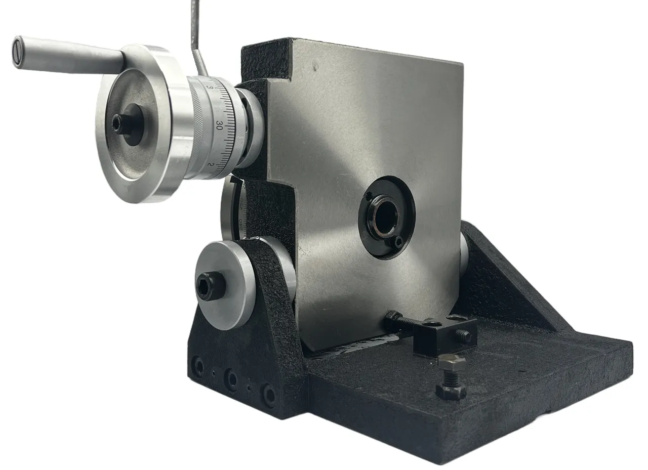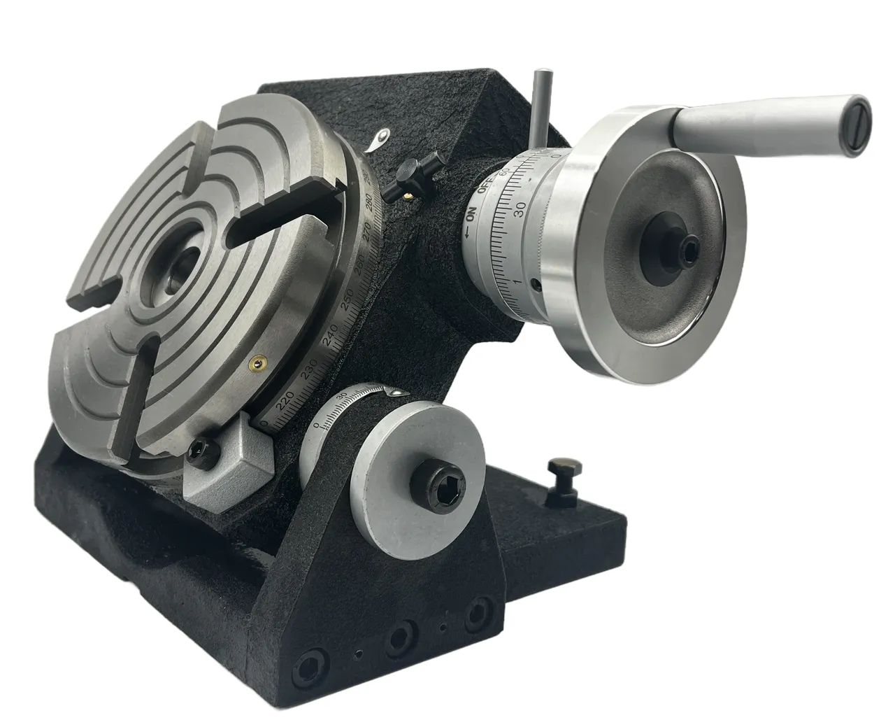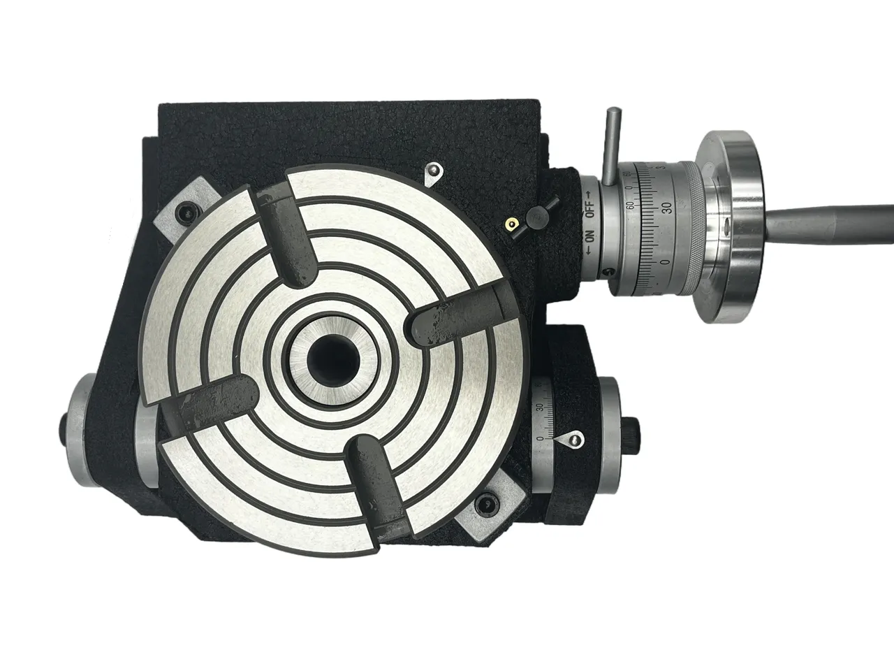 Основание стола оснащено специальными пазами и опорными поверхностями, что обеспечивает надежное крепление к столу станка с помощью прижимов. На поверхности планшайбы предусмотрены радиальные Т-образные пазы для размещения крепежных устройств, а центральное отверстие позволяет установить инструмент со стандартным коническим хвостовиком КМ(конус Морзе).