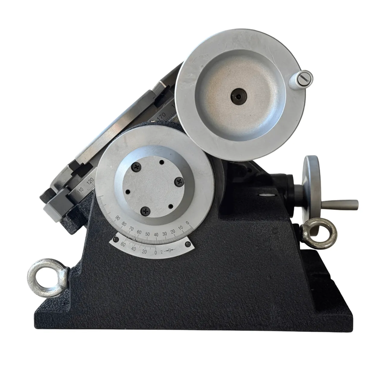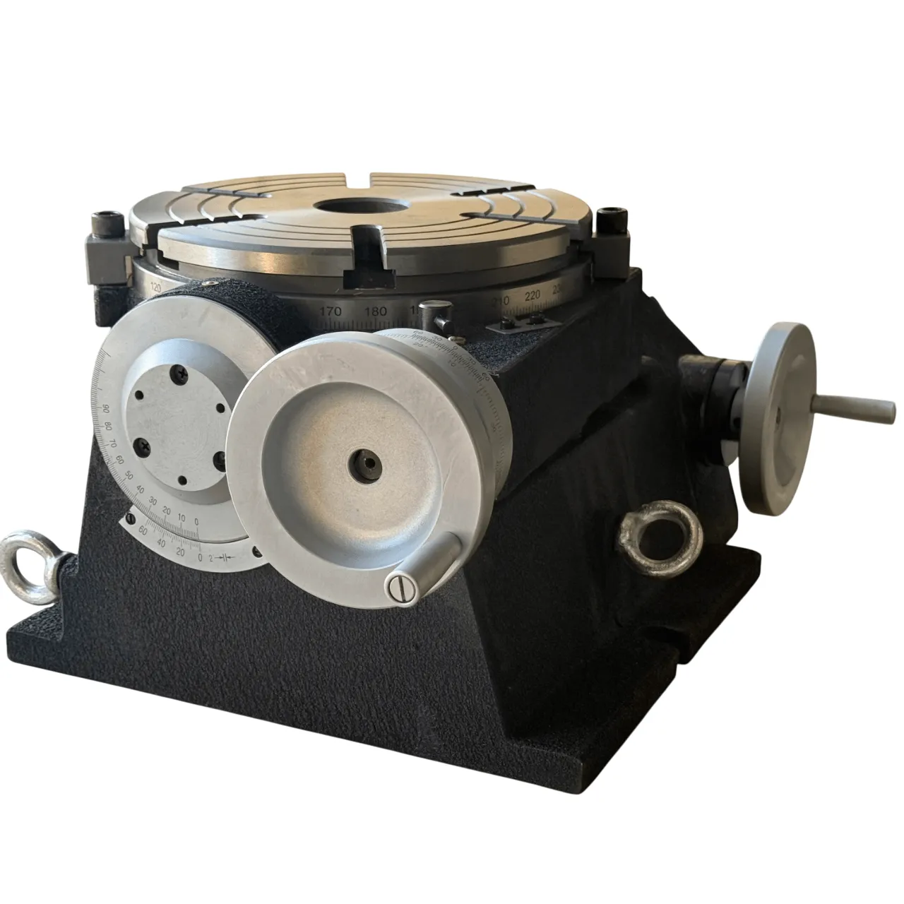 Основание стола оснащено специальными пазами и опорными поверхностями, что обеспечивает надежное крепление к столу станка с помощью прижимов. На поверхности планшайбы предусмотрены радиальные Т-образные пазы для размещения крепежных устройств, а центральное отверстие позволяет установить инструмент со стандартным коническим хвостовиком КМ(конус Морзе).