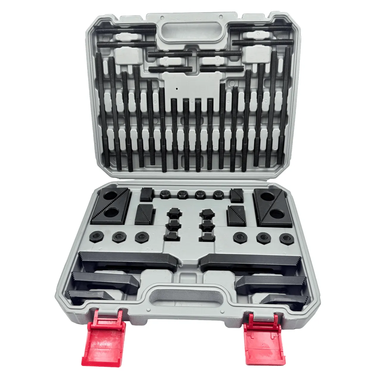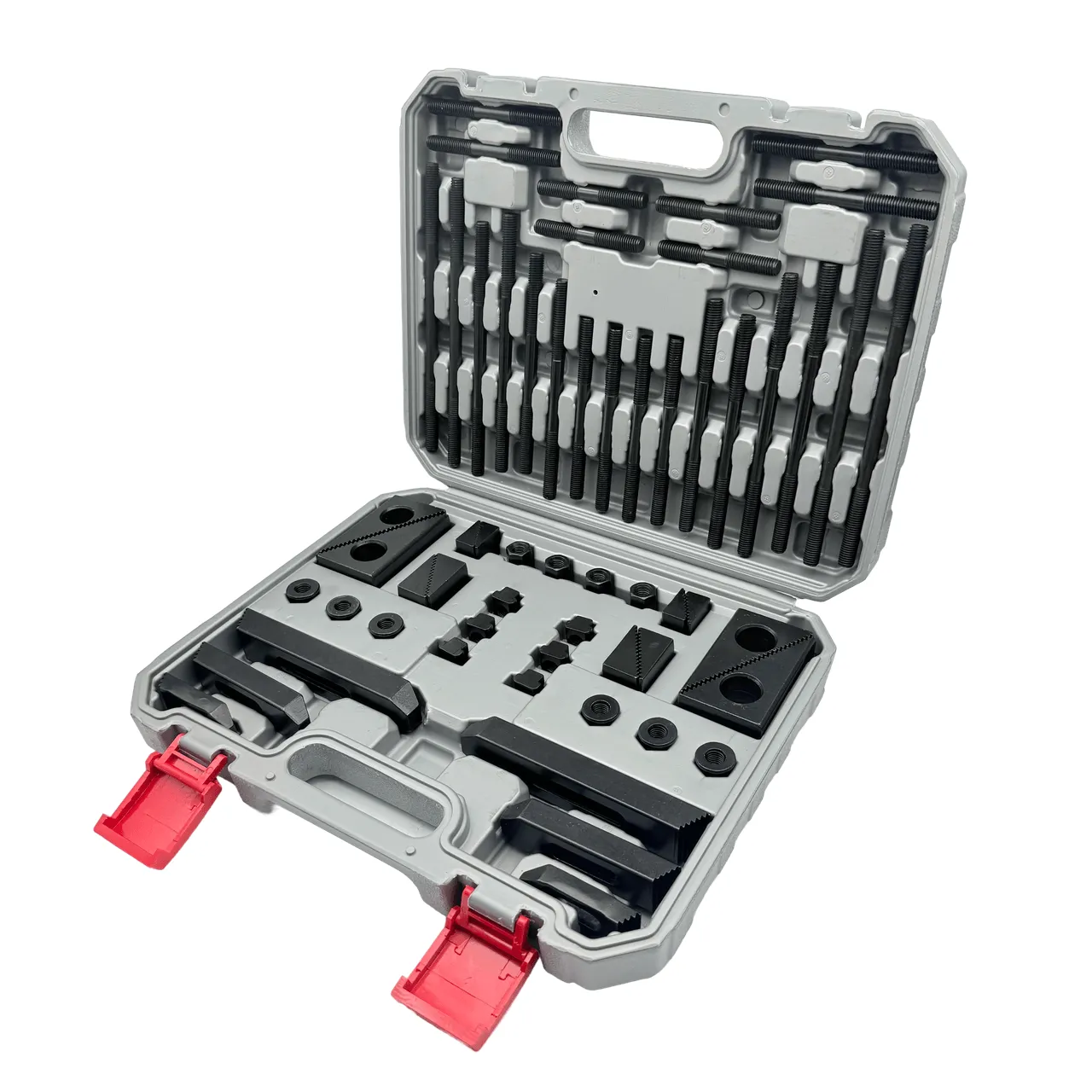 Набор станочных прижимов и крепежа TORNERI из 58 предметов предназначен для надежного удержания заготовок на фрезерных, токарных и ЧПУ станках. Комплект подходит для Т-образного паза 11.7 мм и стандарта М10, обеспечивая удобную и безопасную фиксацию деталей любого размера.